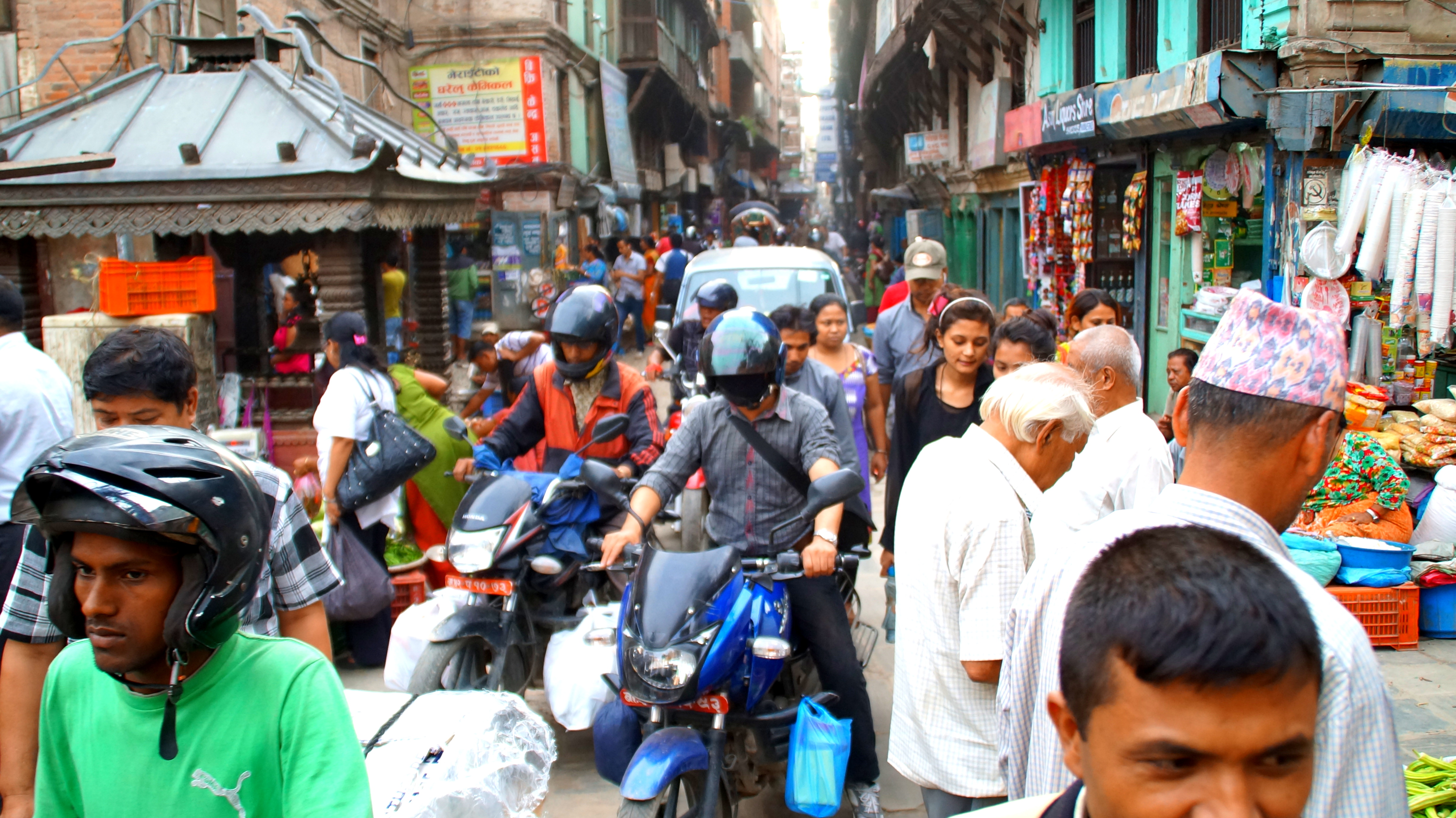 Die vielen kleinen Läden im Touristenbezirk Thamel mit seinen kleinen Gassen und traditionellen Häusern laden zum stundenlangen Spazieren ein. Entspannung sucht man dort jedoch meist vergeblich – denn wenn man nicht gerade achtgeben muss, nicht von einem Auto, Motorrad oder einer Fahrrad-Riksha umgefahren zu werden und einmal tief einatmen will, erinnert einen die bestialisch schlechte Luft daran, dass man dies lieber nicht tun sollte. Nepal hat so wenig Strom, dass es 11 Stunden am Tag von Generatoren abhängig ist. Rechnet man noch die Abgase der veralteten Autos aus dem lebendigen Verkehr hinzu, kann man sich vorstellen, dass ein Gang durch die Stadt permanent so riecht als stünde man hinter einem Auspuff. Daher ist die Gesichtsmaske auch ein relativ verbreitetes Phänomen, auch wenn ich meine Zweifel habe, ob ein Stück Stoff die gefährlichen Partikel der Abgase wirklich aufhalten kann.